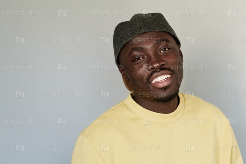 Портрет счастливого молодого чернокожего парня в шляпе и желтой свитерке, стоящего на изолированном фоне