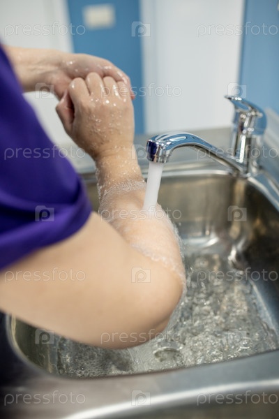 Молодая женщина-врач, ассистент, медсестра или хирург моет руки и запястья