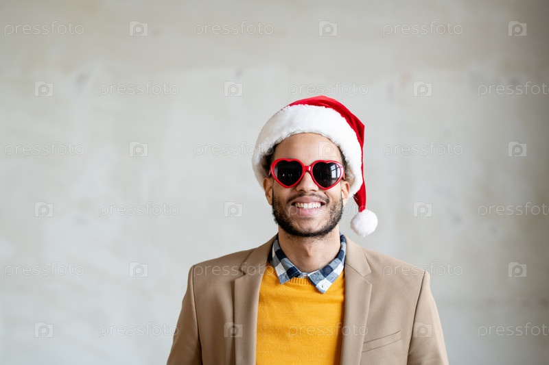 Счастливый молодой бизнесмен смешанной расы в шляпе Санты и солнцезащитных очках в форме сердца