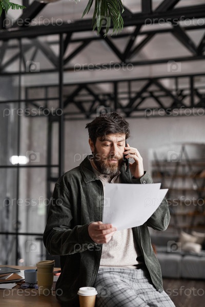 Современный бородатый бизнесмен говорит со смартфона