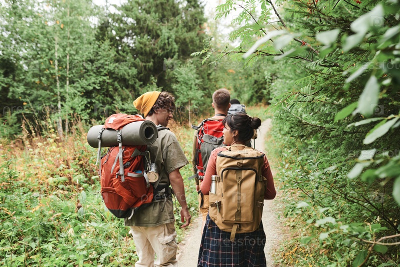 Задний вид молодых людей с рюкзаками, идущих по тропинке в лесу и разговаривающих во время похода