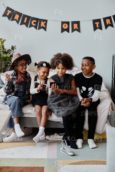 Группа афроамериканских детей на Хэллоуин Indoors