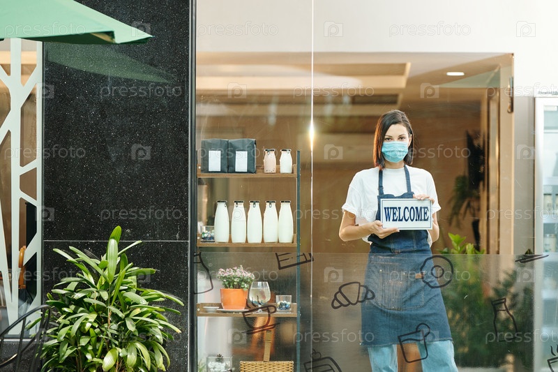 Владелец магазина с знаком приветствия