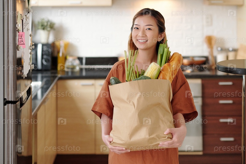 Женщина, держащая мешок с едой
