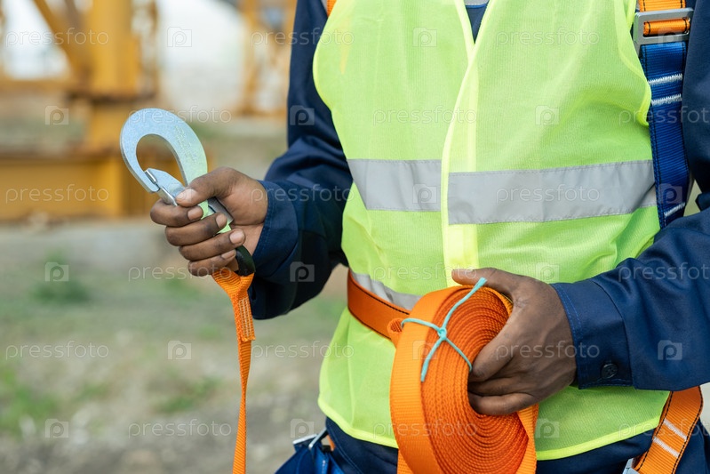 Руки африканского строителя с безопасным оборудованием