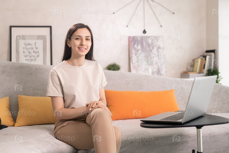 Счастливая молодая женщина сидит на диване перед маленьким столом с ноутбуком, отдыхая в гостиной