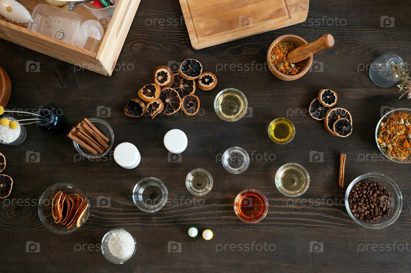 Группа стеклянной посуды с эфирными маслами, кофейными зернами, сухими фруктами и цветами