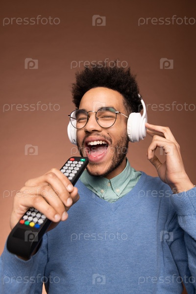 Веселый молодой бизнесмен смешанной расы в наушниках наслаждается музыкой и пением