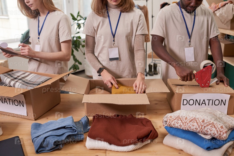 Благотворительные работники упаковывают одежду