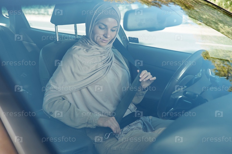 Женщина, застегивающая современный ремень безопасности
