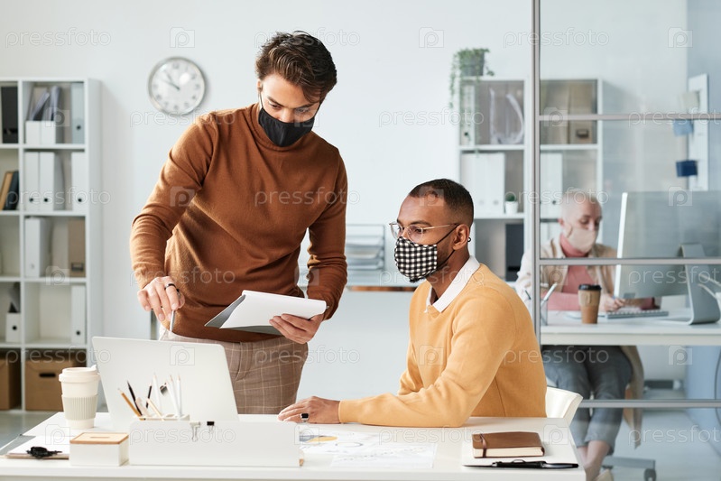 Молодой человек в маске держит клипборд и указывает на ноутбук, сравнивая данные с коллегой