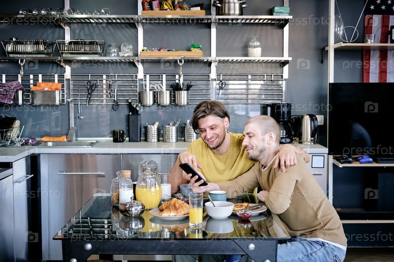 Два мужчины прокручивают смартфон над кухонным столом