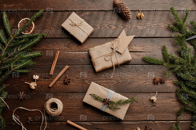 Рождественские подарки на деревянном фоне