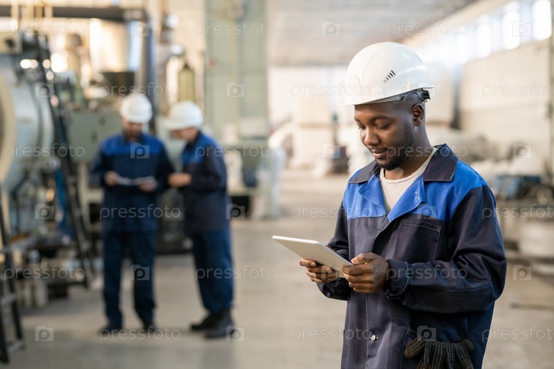 Молодой африканский мужчина-фабричный рабочий в комбинезонах и жесткой шляпе, использующий цифровой планшет против коллег