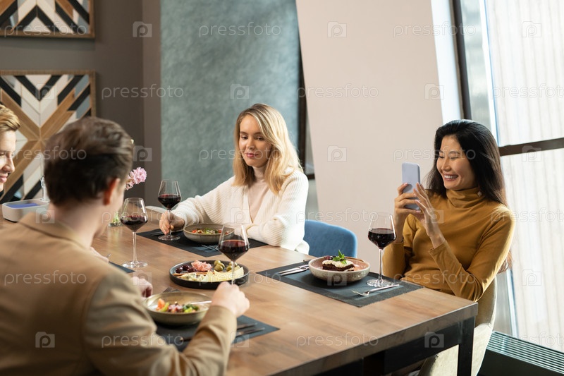 Молодая счастливая азиатская женщина со смартфоном, фотографирующая парней за ужином