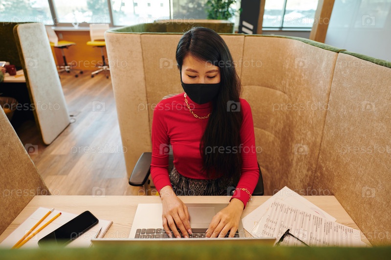 Молодая азиатская бизнесвумен в умной повседневной одежде и защитной маске сети