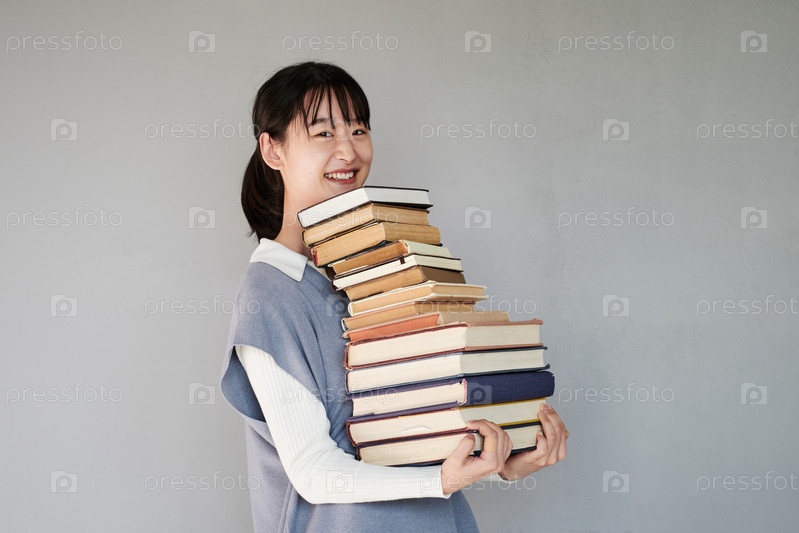 Портрет позитивной азиатской студентки, стоящей с кучей книг на сером фоне