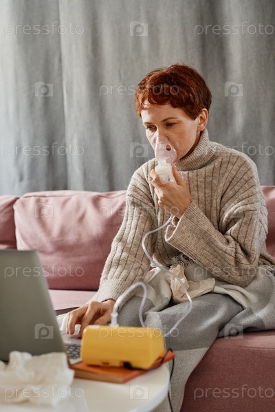 Вертикальный снимок зрелой женщины, страдающей коронавирусом, сидящей дома на диване с использованием небулайзера и смотрящей фильм на ноутбуке