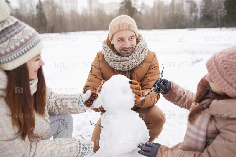 Семья строит снеговика в зимнем парке Happy