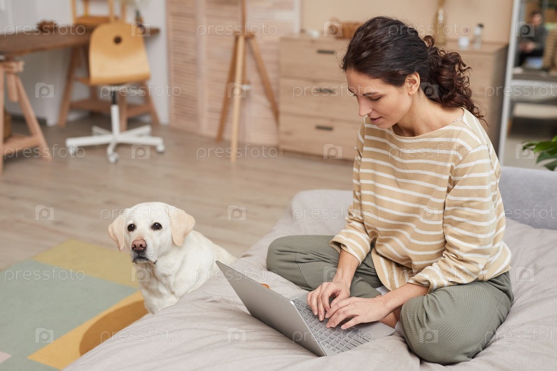 Молодая женщина, работающая из дома с собакой