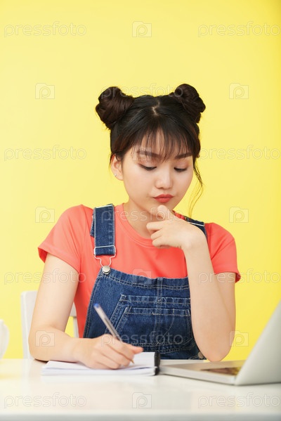 Красивая молодая женщина, пишущая в копийке