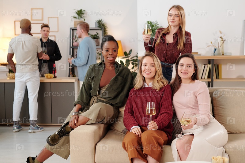 Счастливые молодые межкультурные женщины с флейтами шампанского наслаждаются домашней вечеринкой