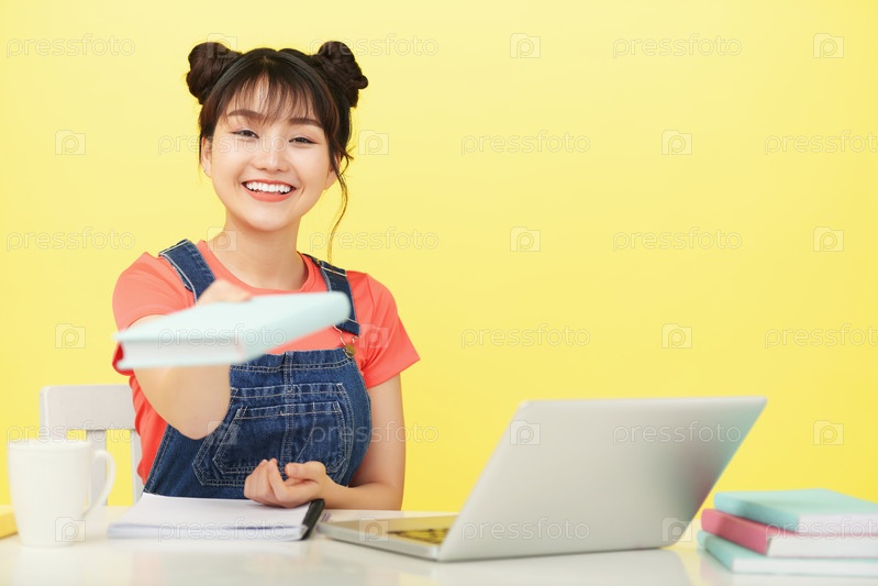 Улыбающаяся молодая женщина дарит книгу