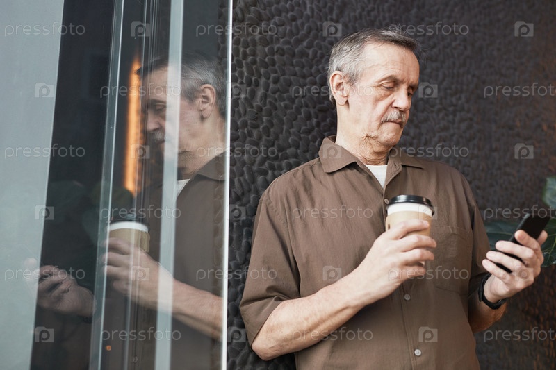 Загруженный старший менеджер с кофе читает сообщение по телефону