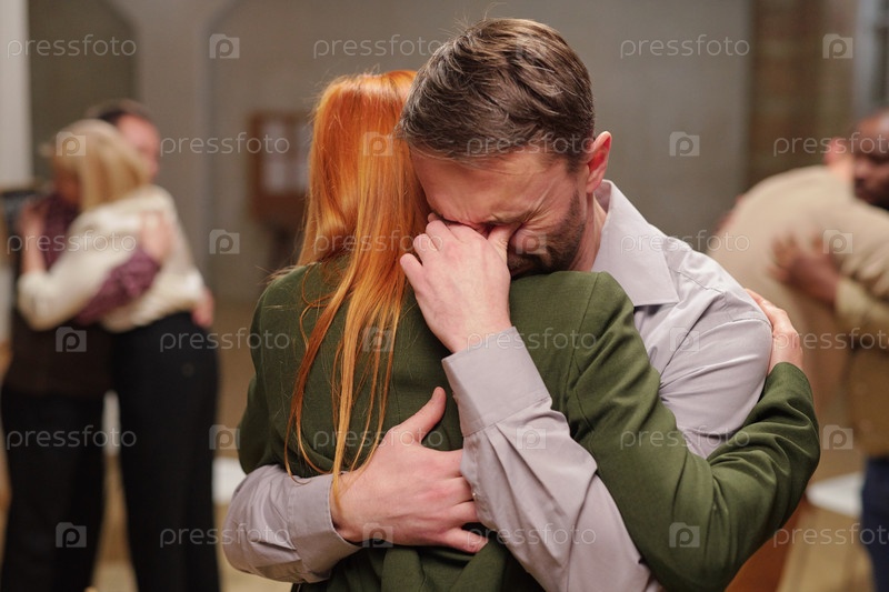 Плачущий мужчина поддерживается женщиной в зеленом костюме