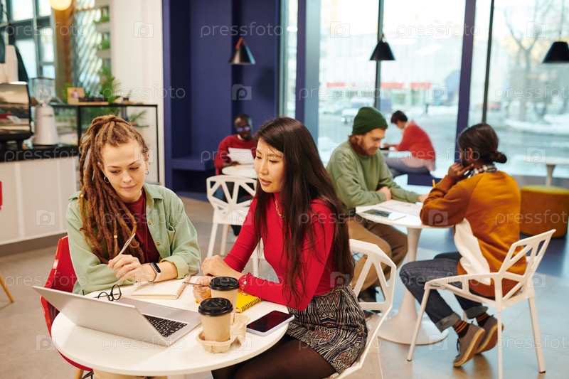 Две молодые межкультурные бизнес-женщины, работающие над презентацией вместе