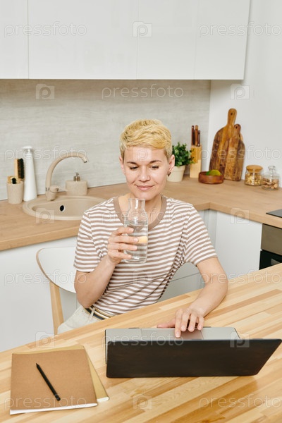 Деловая женщина со стаканом чистой воды, используя ноутбук