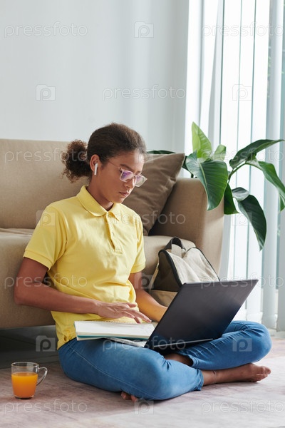 Серьезная девушка выполняет задание с помощью ноутбука