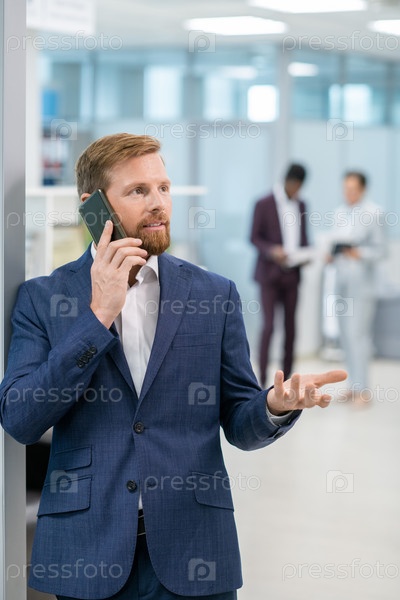 Бородатый бизнесмен общается на смартфоне против двух коллег