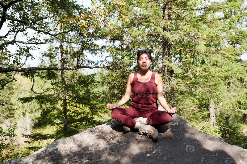 Спокойная молодая женщина с закрытыми глазами, сидящая со скрещенными ногами и держась за руки в мудре во время медитации в горах