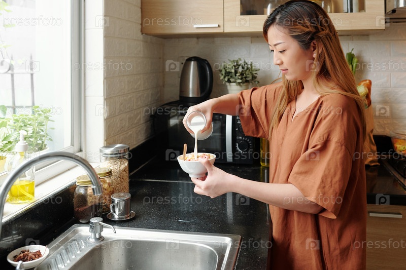 Красивая женщина, наливающая молоко в миску
