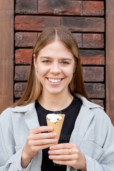Счастливая блондинка с мороженым стоит у кирпичной стены