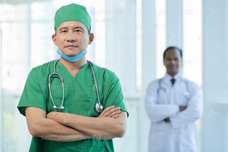 Уверенный врач в зеленых скрабах