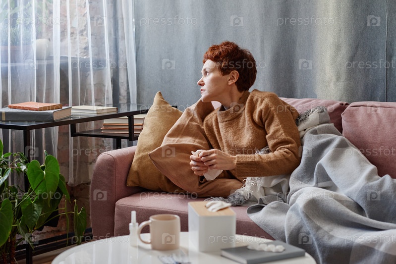 Горизонтальный снимок женщины, страдающей от гриппа, держащей бумажный салфетку, расслабляющаяся на диване дома и оглядываясь в сторону
