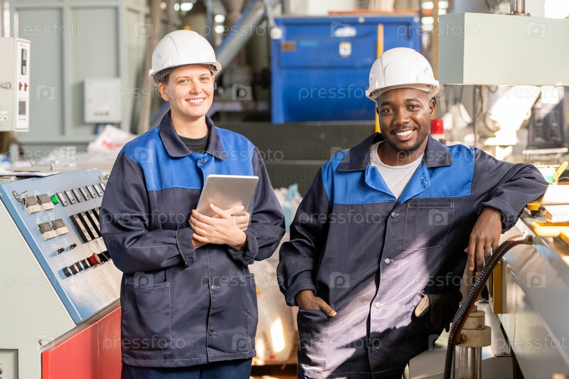 Два молодых успешных рабочего в комбинезонах и шапках, стоящих против огромной промышленной машины