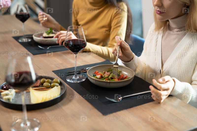 Девушка в умной повседневной одежде, имеющая овощный салат, красное вино, сыр и оливки