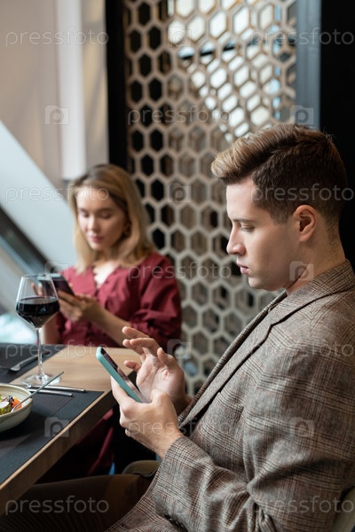 Молодой серьезный мужчина и женщина в умной повседневной одежде прокручивают свои смартфоны