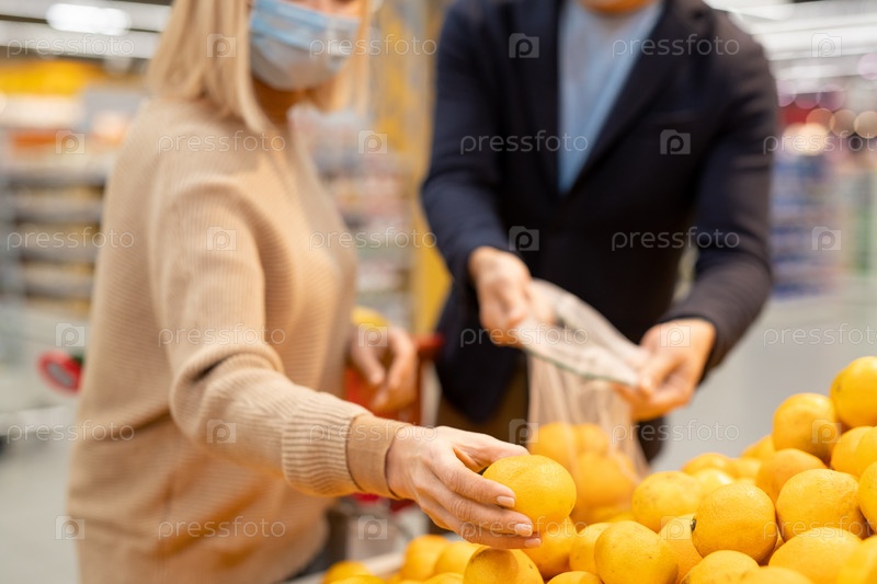 Зрелая пара в повседневной одежде и защитных масках выбирает свежие спелые мандарины