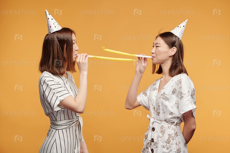 Счастливые молодые великолепные близнецы в умных платьях и шапках на день рождения наслаждаются вечеринкой