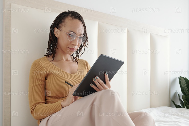 Женщина корректирующая документ на планшете