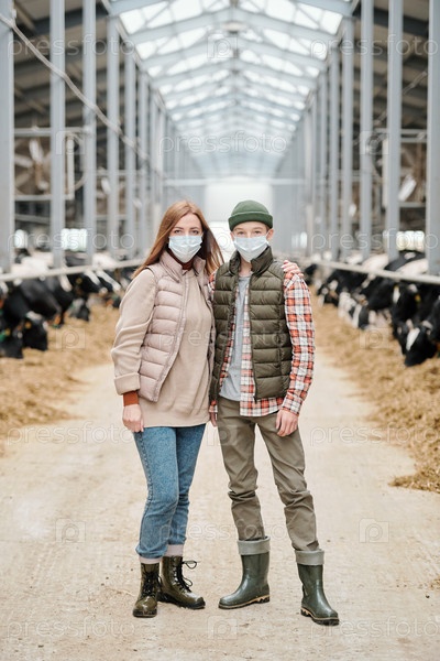 Работница животноводческой фермы и ее сын в повседневной одежде и защитных масках