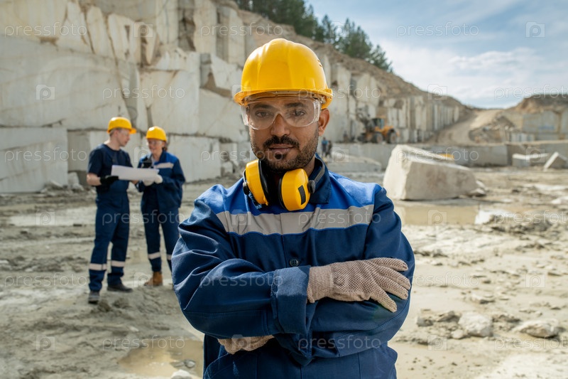 Молодой серьезный строитель в рабочей одежде