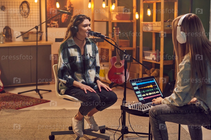 Женщина сидит в студии звукозаписи