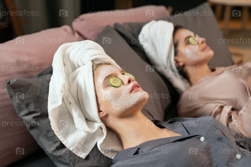 Две девочки с глиняными масками на лицах и нарезами огурцов в закрытых глазах лежат на кровати