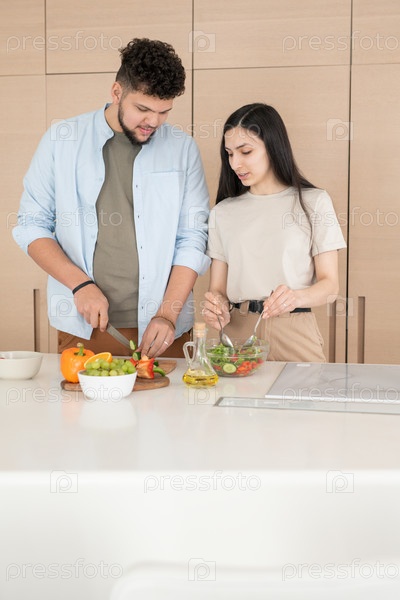 Молодой человек режет овощи для салата