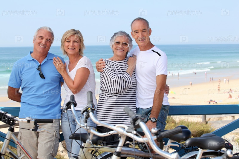 Портрет четырех человек с велосипедами на пляже